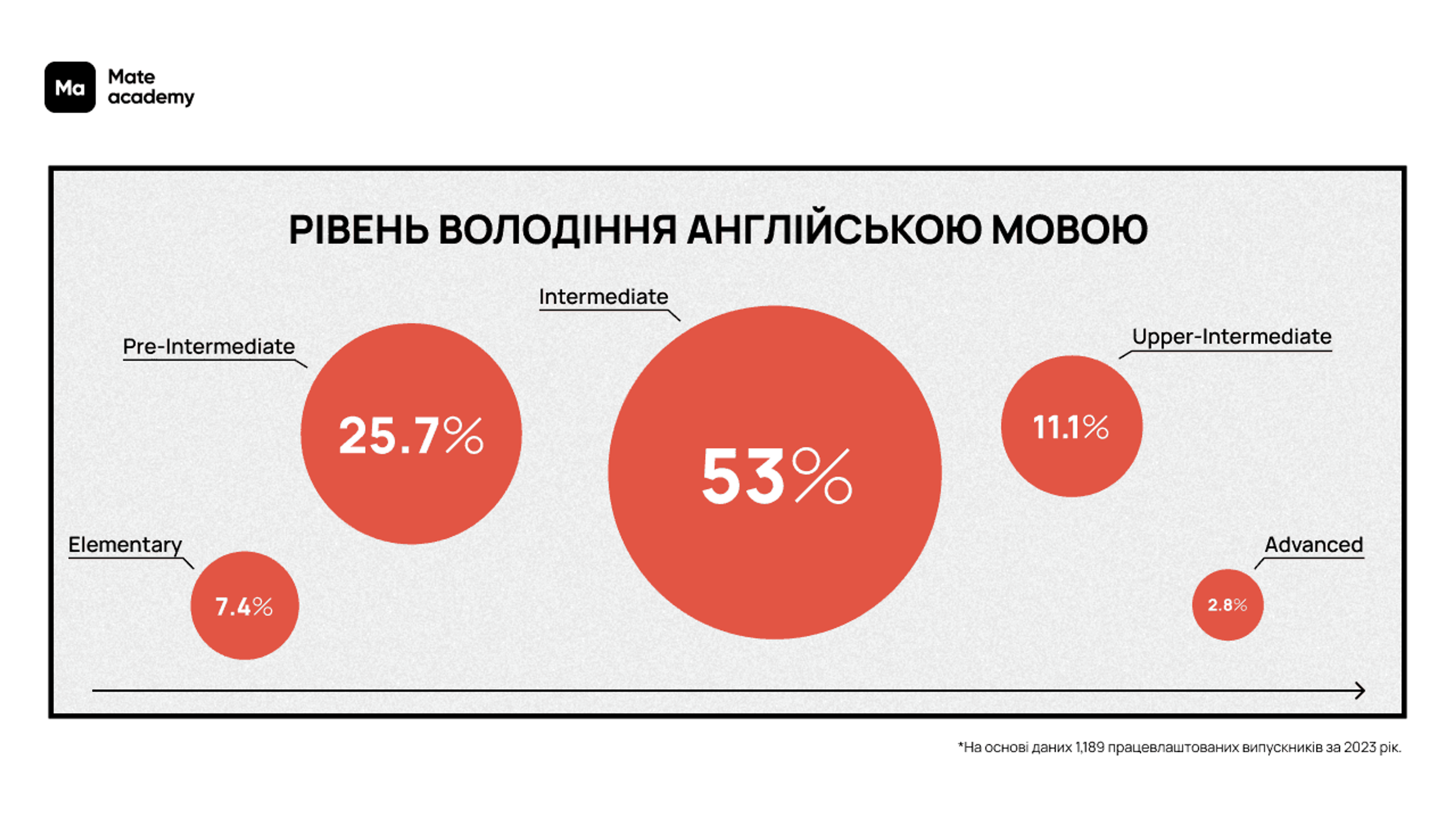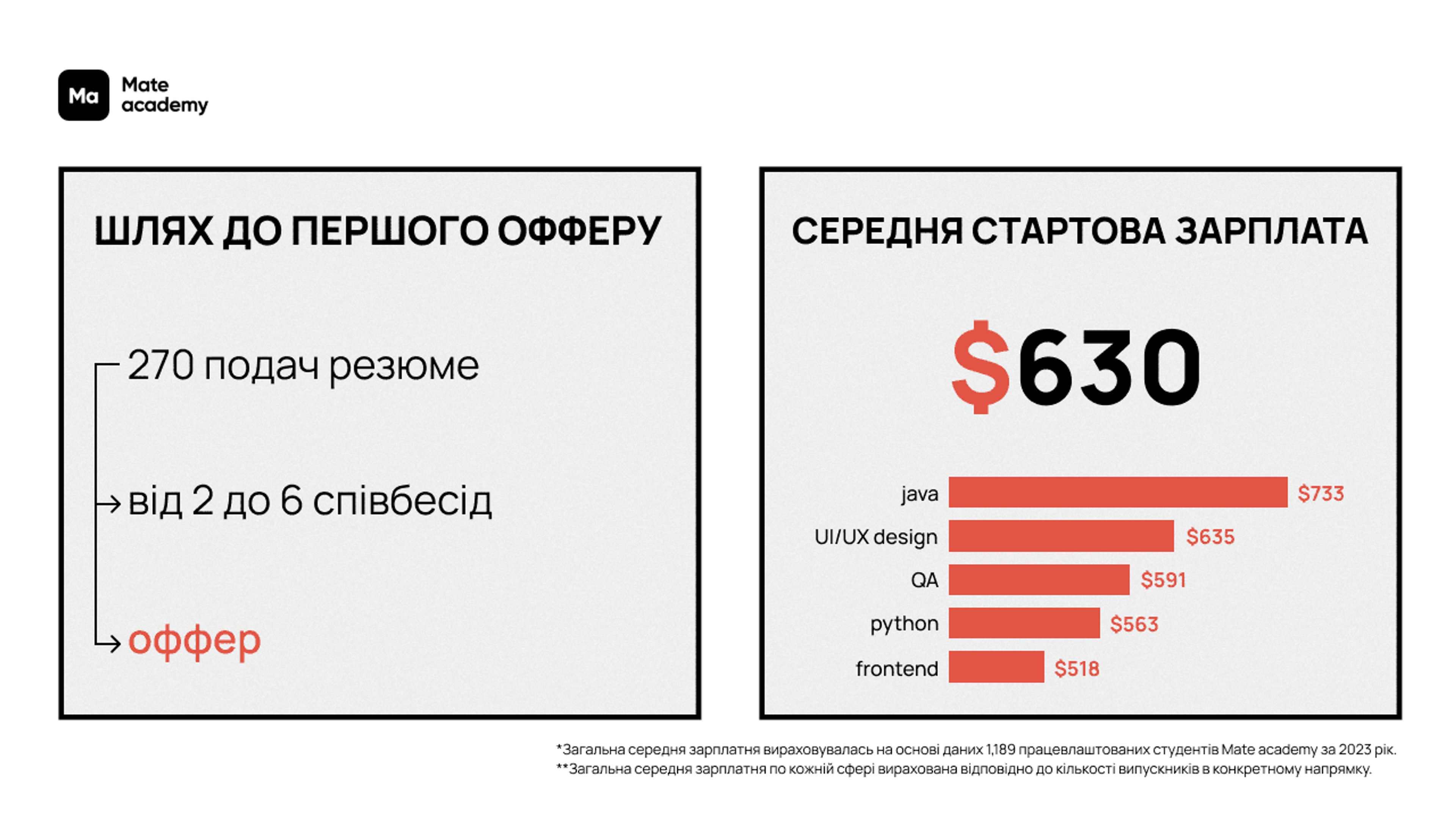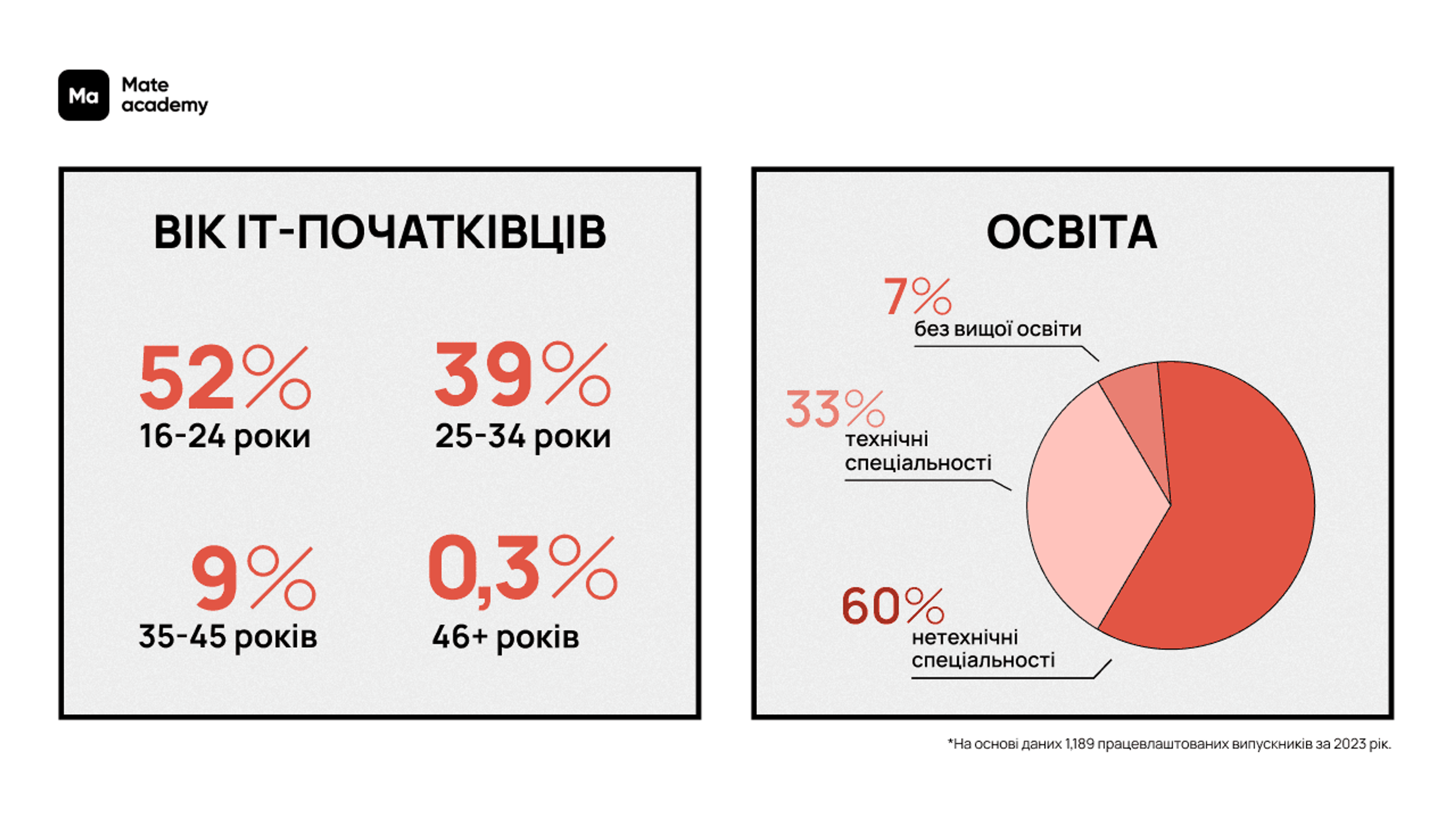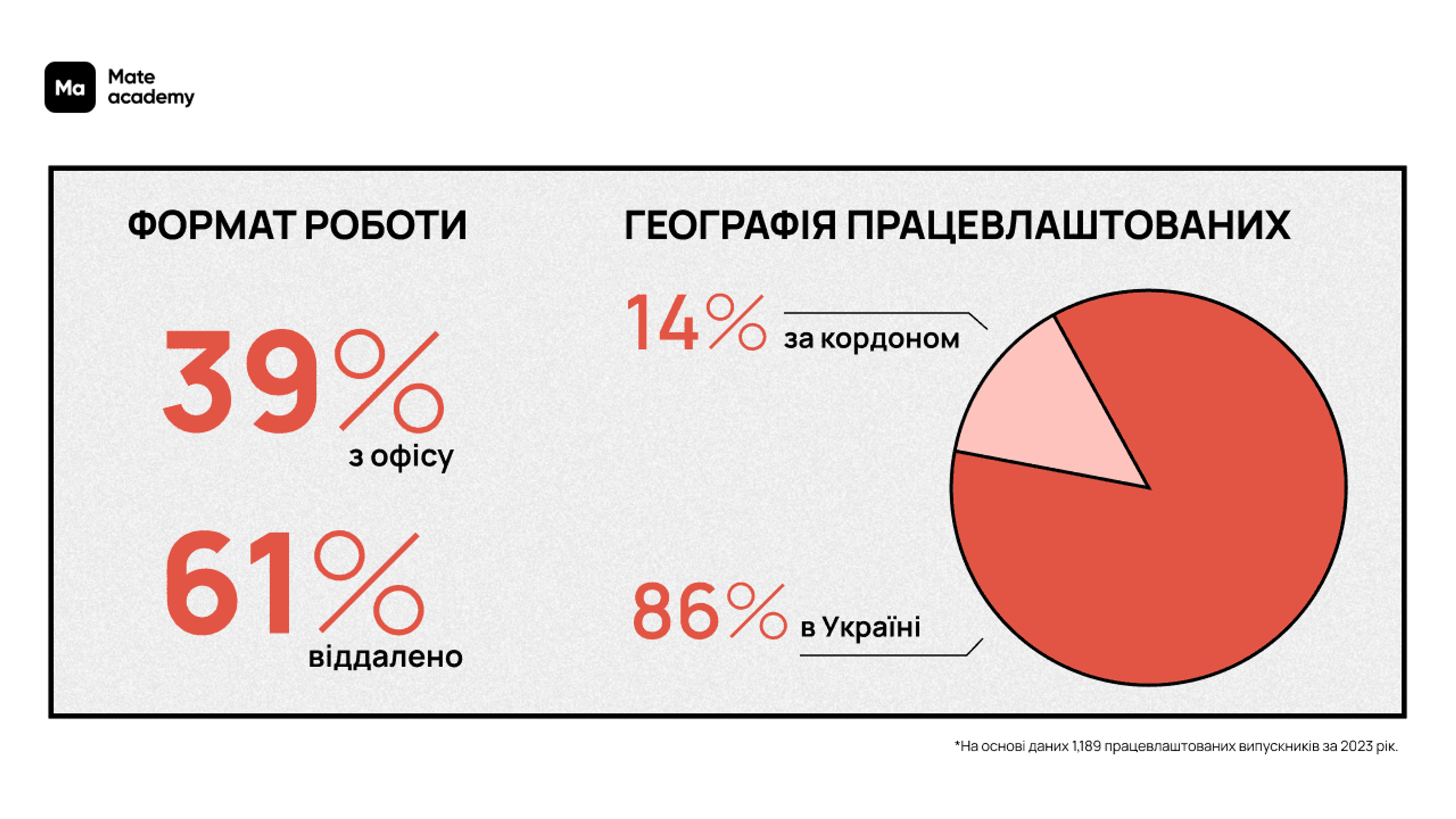 Як онлайн-академія ІТ-професій ділимось головними цифрами та інсайтами, якими відзначився 2023 рік у контексті працевлаштування випускників Mate academy на junior-позиції. В основі — дані 1,189 випускників академії, які почали кар'єру в ІТ минулого року.