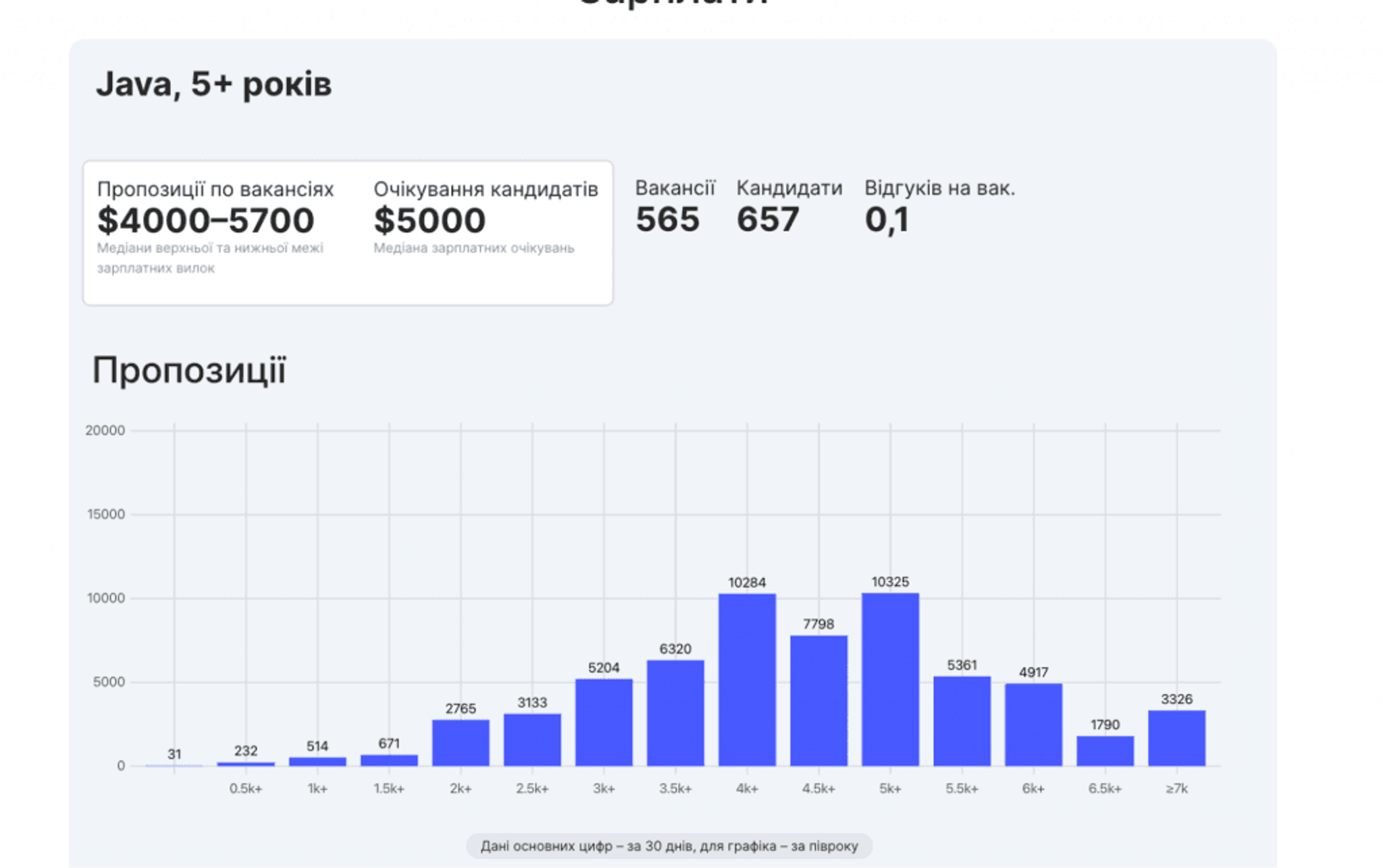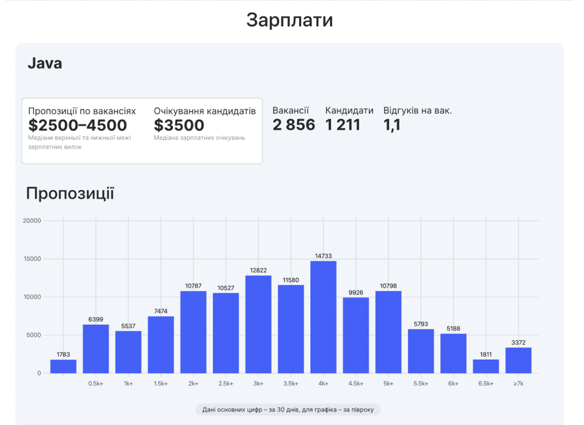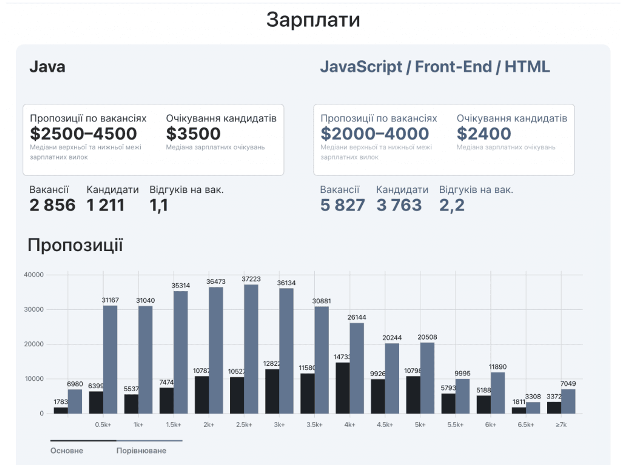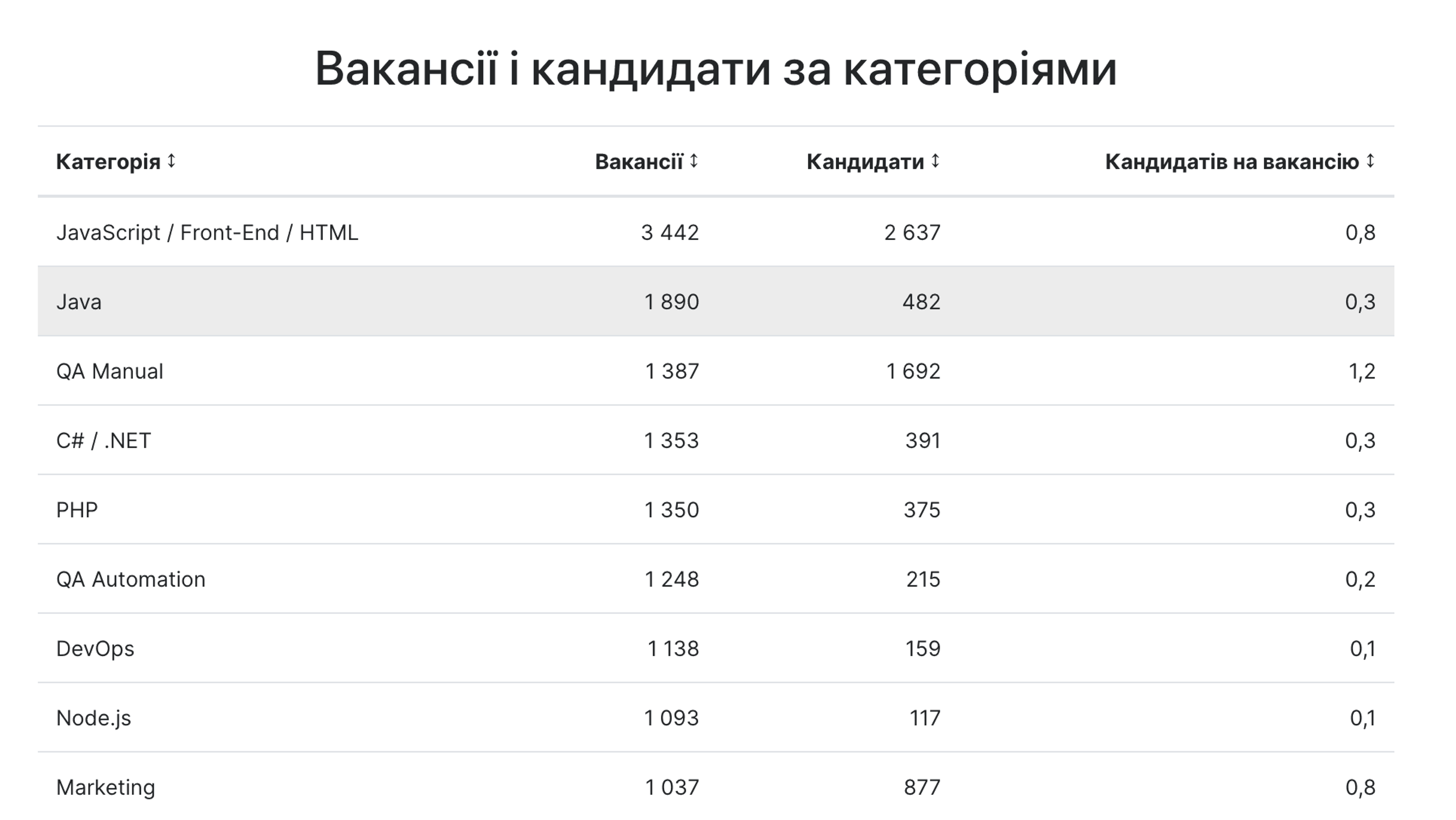 На сайте есть раздел "Аналитика Джина", где можно сравнить зарплаты в IT-индустрии, узнать градацию спроса и предложений, а также найти вакансии по категориям. апример, сейчас наблюдаем тенденцию роста спроса на специалистов по категории Java – 1890 вакансий, это второе место после Javascript / Front-End / HTML категории, где больше всего вакансий – 3442. Однако, если говорить о конкуренции, сейчас в Java – всего 0.3 кандидата на вакансию. Это означает, что для разработчиков этой категории есть больше преимуществ и шансов получить работу, ведь соотношение кандидата на позицию значительно меньше.