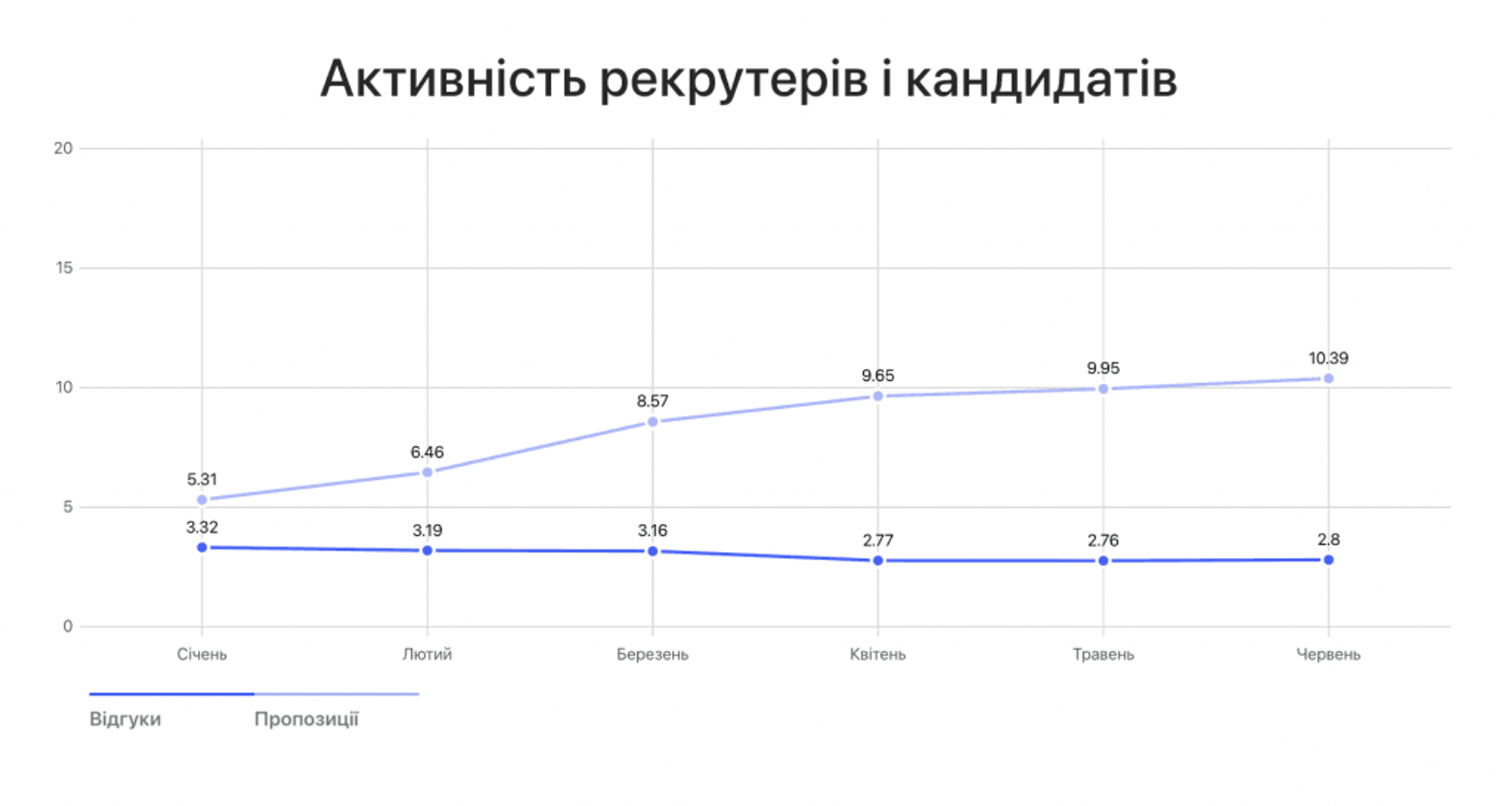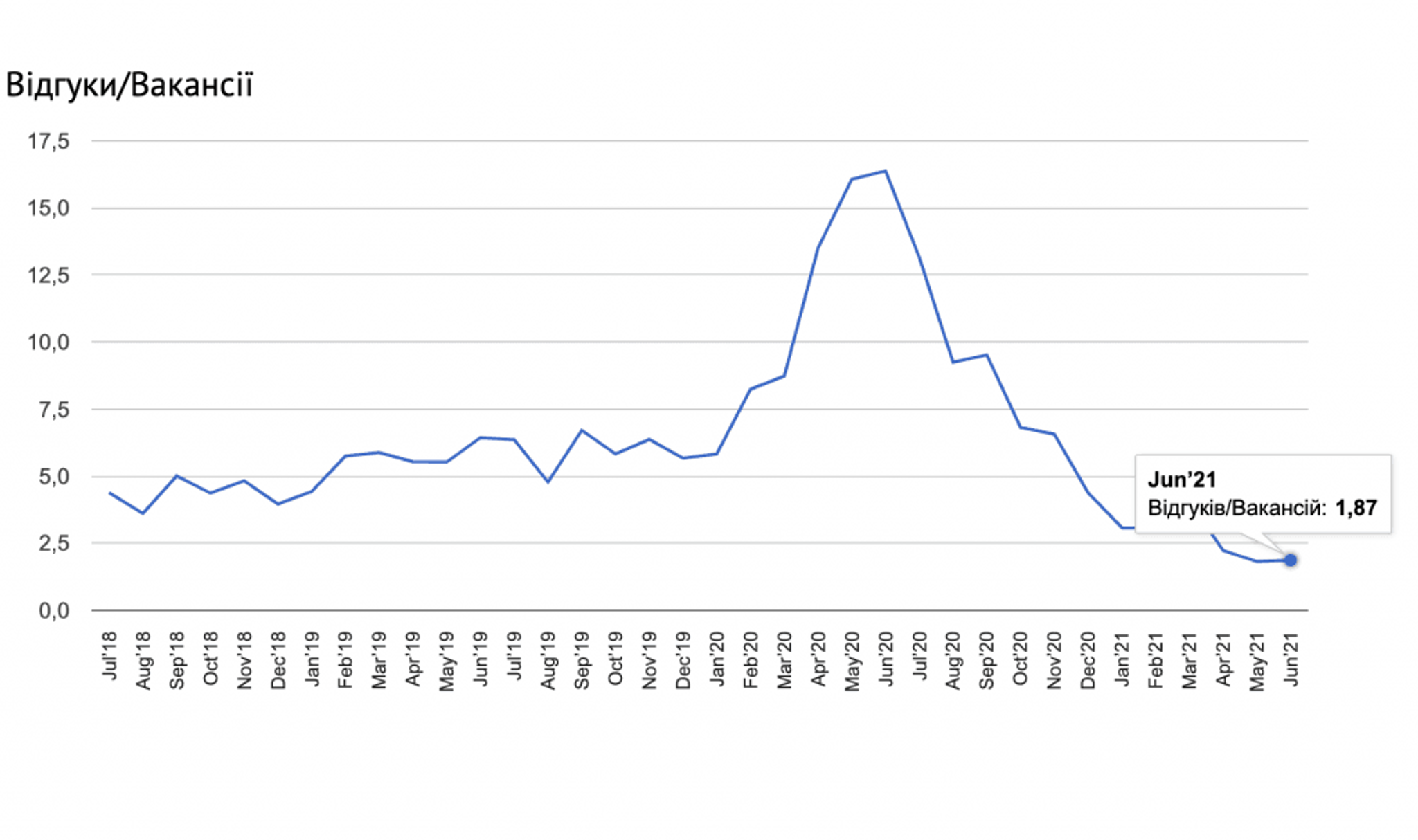 Аналогично с предыдущим ресурсом, аналитика DOU показывает, что количество отзывов на вакантные позиции стремительно снижается. В июле 2020 года было 5 отзывов на вакансию, в этом году этот показатель едва дотягивает до 2, что демонстрирует нехватку кадров все больше.