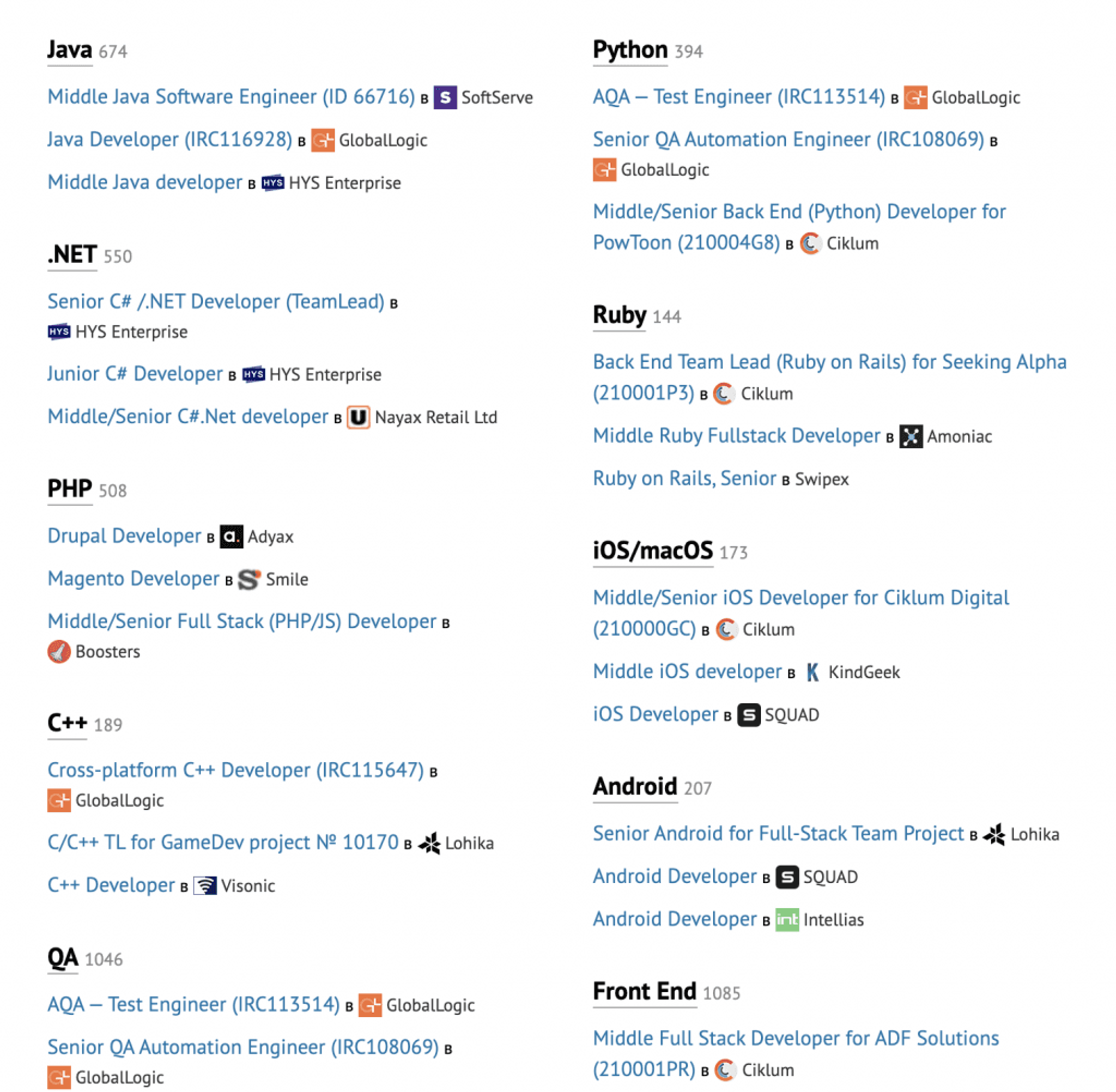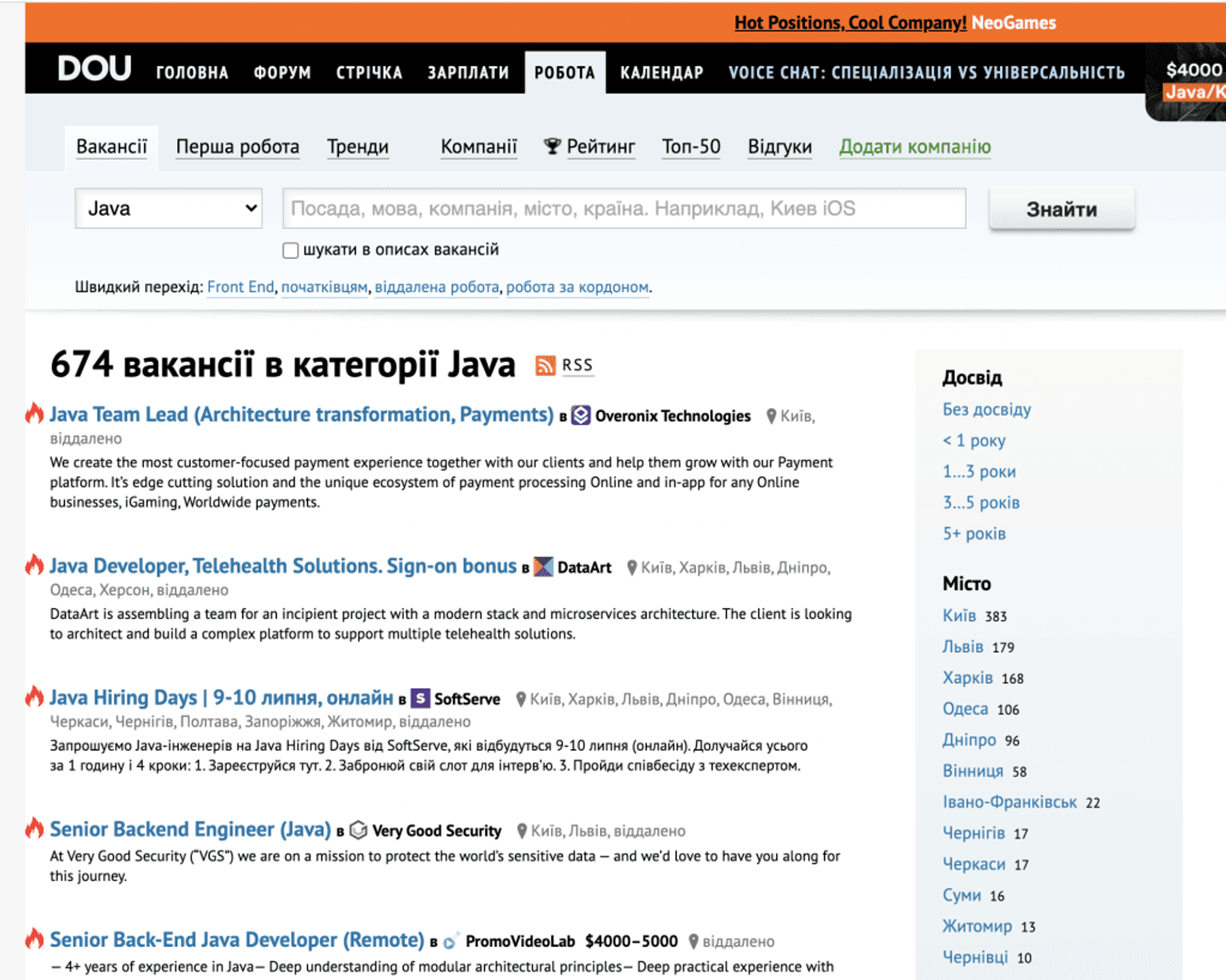 Как и Djinni, DOU визуализирует статистикой нехватку кадров в IT-сфере. Кандидаты используют этот ресурс для поиска позиций и компаний мечты. Сейчас в категории Java почти 700 вакансий.