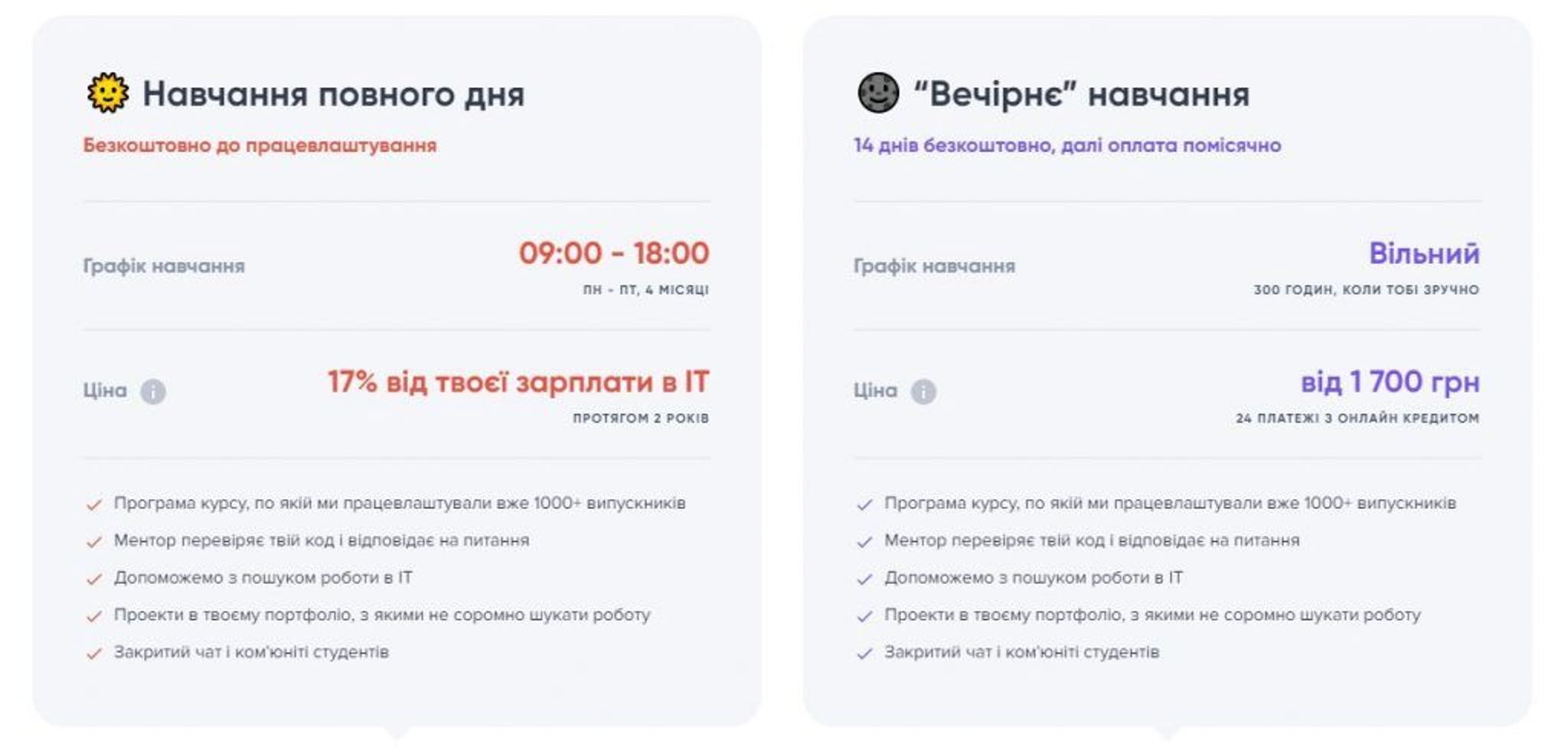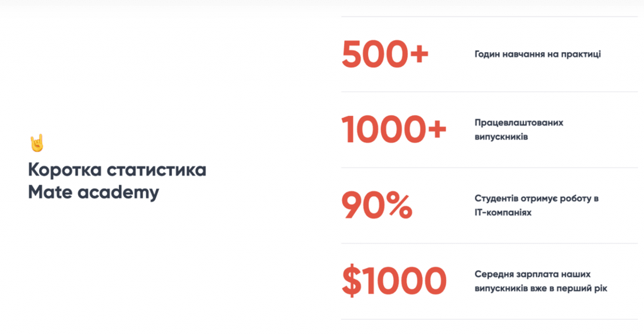На украинском рынке курсов IT особо выделяется Mate academy. Компания трудоустроила более тысячи студентов сразу после обучения, а некоторых еще даже до выпуска. Особенностью и преимуществом является то, что платить за курс можно после, возмещая процент от зарплаты в компании, устроиться в которой помогают mates.