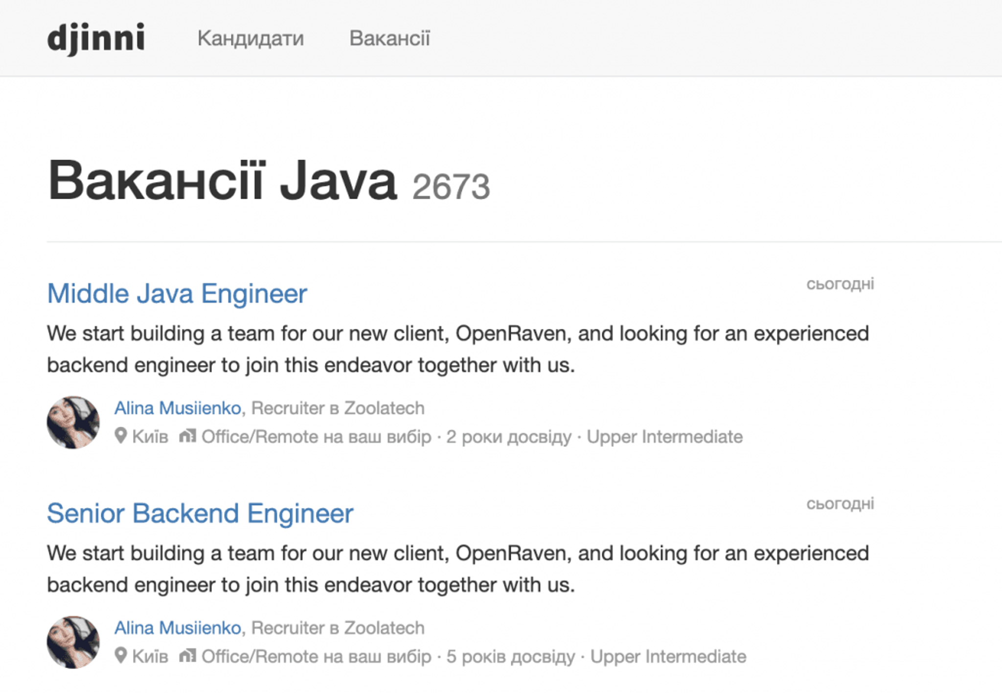 Djinni.co – сервис анонимного поиска работы для программистов. Сейчас на ресурсе более 2500 вакансий для java программистов.