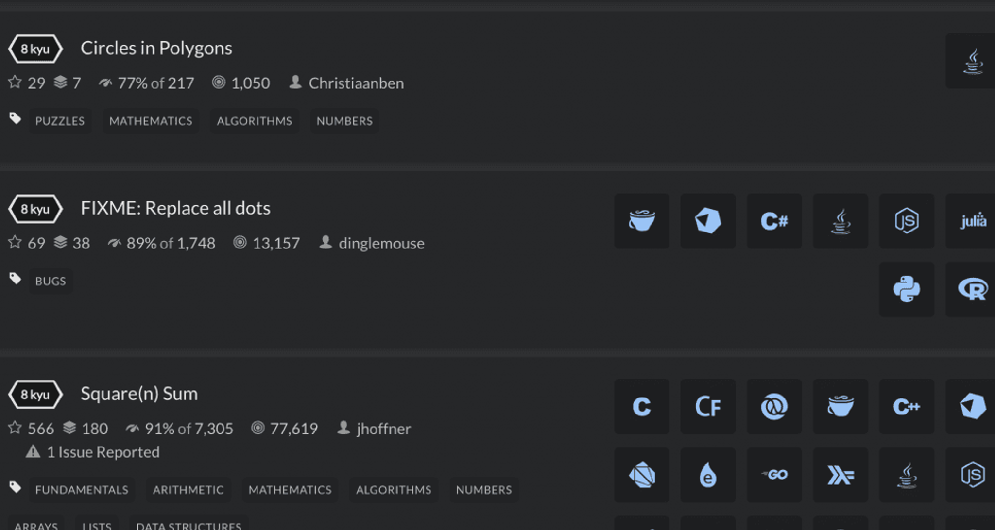На Codewars принцип тот же: читаешь условие, пишешь код, запускаешь и смотришь результат. Если код не работает даже после подсказок, можно посмотреть готовое решение. Задача постепенно усложняются от 8 до 1 kuy.